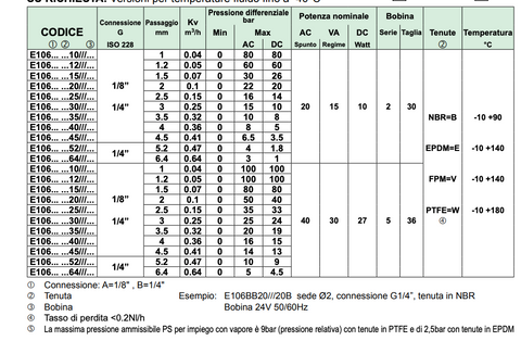 Elettrovalvola 2 vie normalmente chiusa comando diretto ad otturatore, Corpo Ottone, Tubo guida AISI 303, Nucleo fisso e mobile AISI 430FR, Molle AISI 302, Organi di tenuta NBR,