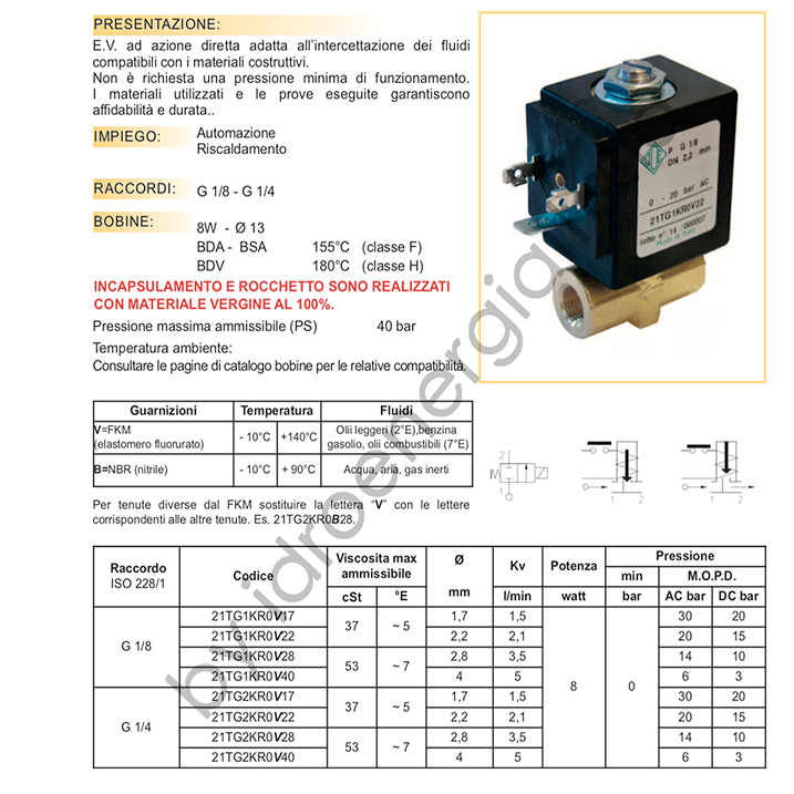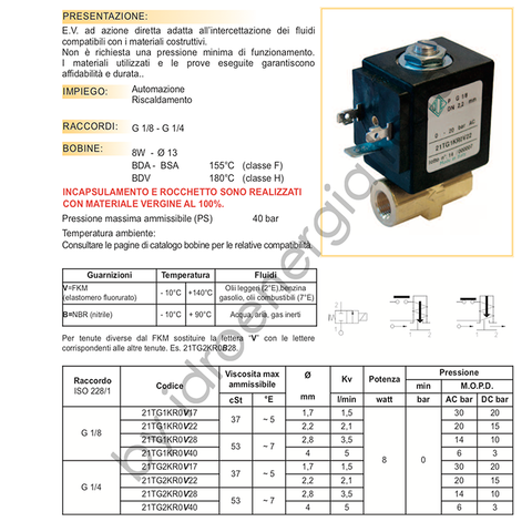 ELETTROVALVOLA 21TG2KR0V40-BDA08223DS originale ODE 1/4 220v passaggio 4mm comando diretto normalmente chiusa per prodotti compatibili con ottone e Viton comando diretto portata 5 litri al minuto pressione differenziale di funzionamento 0-6bar pressione massima ammissibile 40 bar